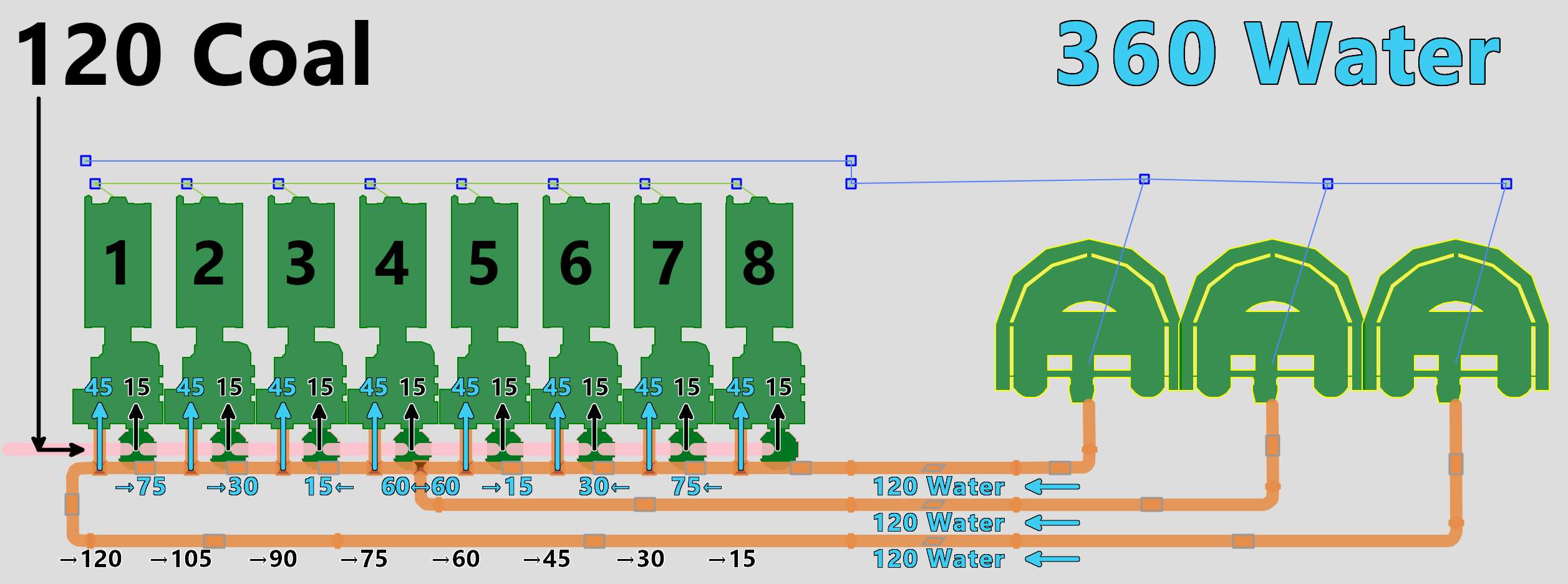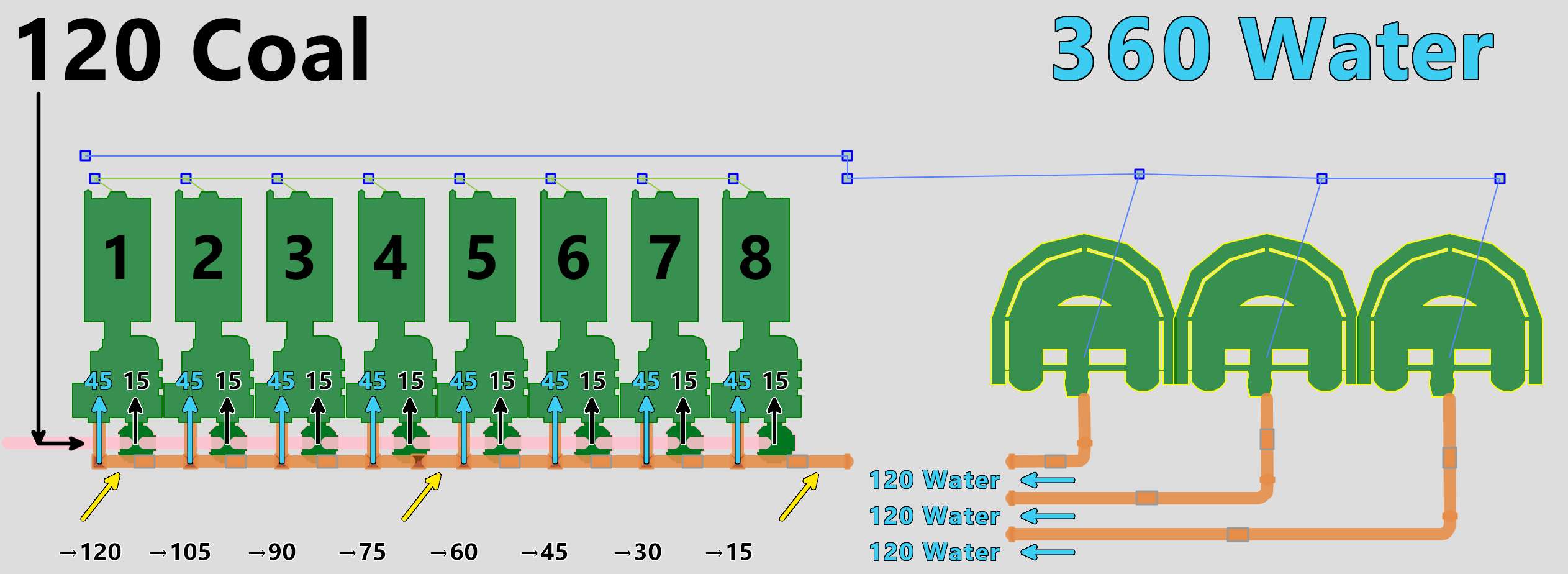 Wait up, so how are we going to be able to feed 8 coal generators needing 360 water pm when that exceeds the pipe maximum throughput rate of 300 pm? Well there's nothing saying that we need to supply that water through just one pipe, it comes down to how you connect those water extractors to the coal generators.