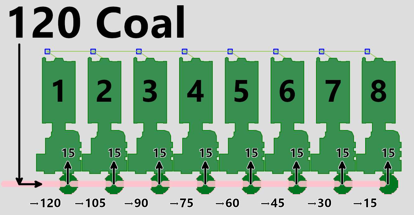 When using a conveyor belt manifold, the machines at the end of the manifold will take a long time to receive coal, as each machine along the manifold receives half of the coal and so on. This will lead to unreliable power until the whole manifold is saturated, so a way to avoid this is to pre-load each coal generator with stack of coal.