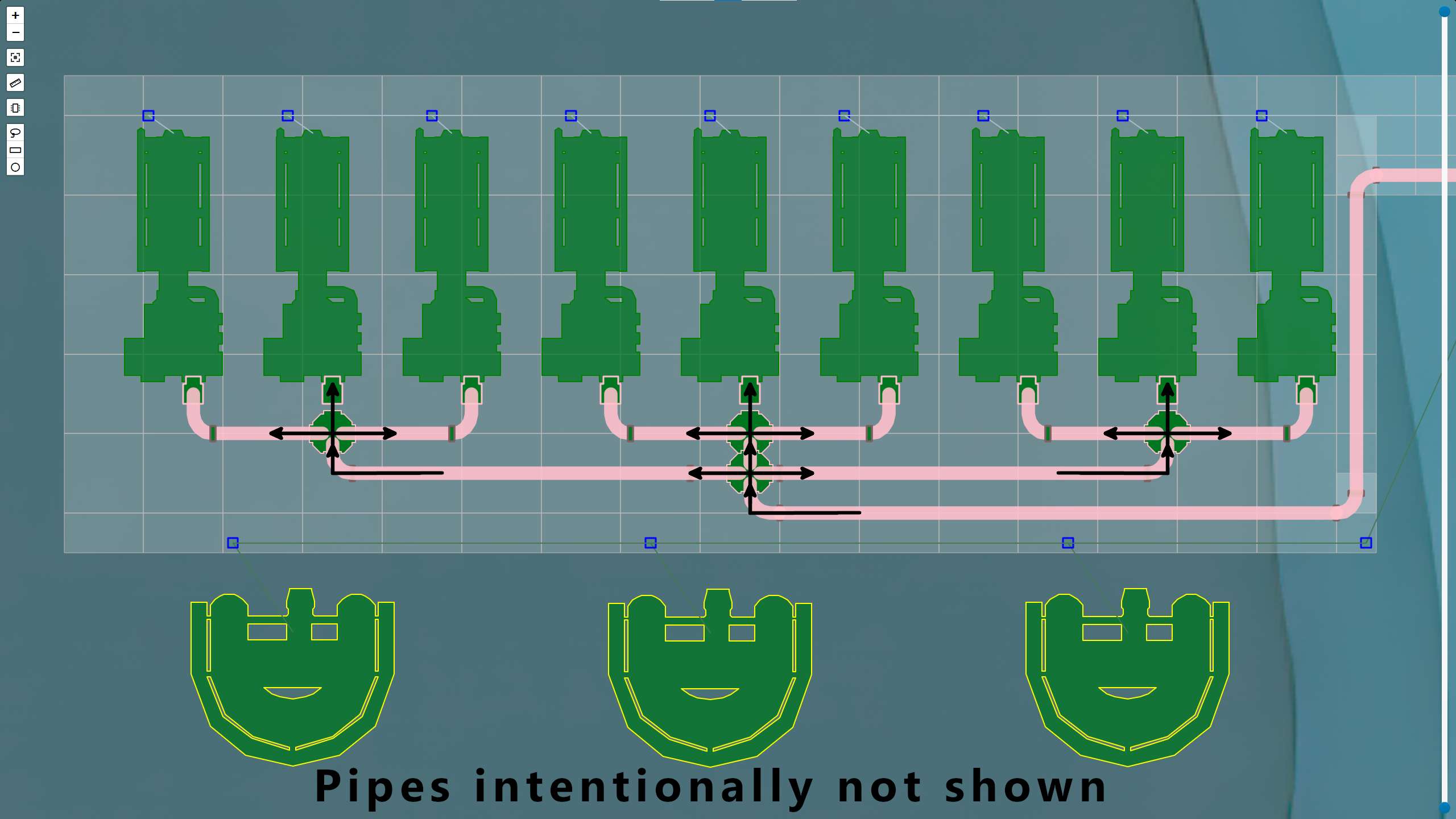 Looking at this build screenshot you can see a pipe manifold is used to feed this water to all of the 8 generators, but as previously stated that's technically not possible.