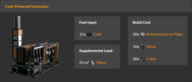 So I just threw a bunch of numbers at you and you're probably wondering what they mean. Well lets look at the coal generator. It is the first machine you come across with two inputs of different types, on the left is a pipe and the right is a conveyor. A coal generator requires 15 coal pm and 45 water pm an it generates 75 MW of power.