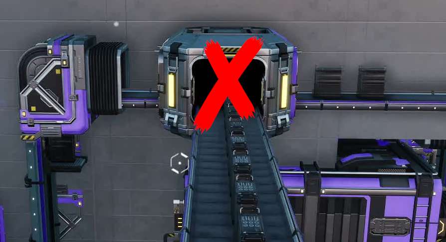 - The red arrow below shows the conveyor belt clipping into the top of the splitter/merger